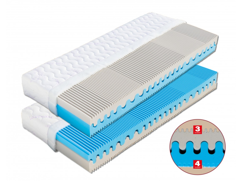 Pevná ortopedická matrace s volbou dvojí tvrdosti, která Vás nadchne špičkovou kvalitou vysoce gramážních pěn. Její provzdušněný střed se díky různě širokým vlnkám výborně přizpůsobí ležícímu tělu. Měkčí strana – to je luxusní pěna značky Cellflex (40 kg/m³), která je díky svým otevřeným buňkám prodyšná a zajistí vynikající rozložení tlaku na matraci. Díky vysoké hustotě je velmi odolná a příjemná. Pevnější strana je tvořena tvrzenou modrou pěnou MediFoam (35 kg/m³). Obě pěny jsou na povrchu příčně profilované do vlnek pro větší vzdušnost a lepší rozložení váhy těla.Celková výška matrace cca 22 cm.