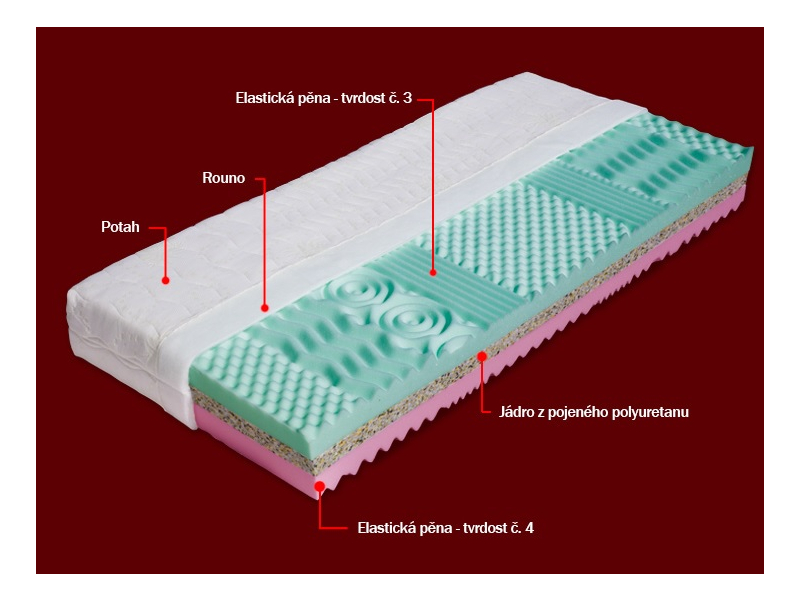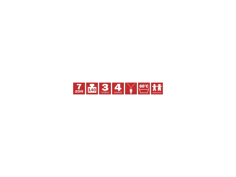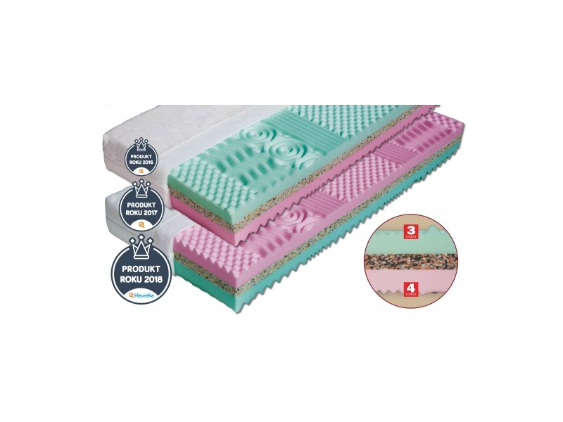 Sedmizónová sendvičová matrace s volbou dvojí tuhosti. Střed jádra matrace je zpevněn pojeným polyuretanem. Nosné vrstvy jsou tvořeny kvalitními elastickými pěnami, které jsou tvarovány do masážních nopů. Nopy zabezpečují prokrvení pokožky a uvolnění svalů během spánku. Matrace je vhodná na všechny typy roštů, s výjimkou motorového roštu.