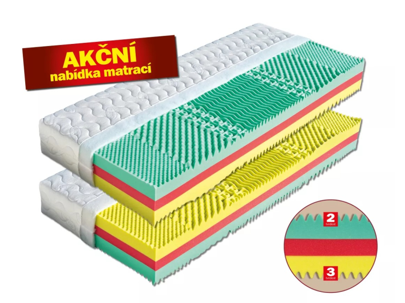 Luxusní matrace s variantou 2 tvrdostí z kvalitních antibakteriálních pěn. Červená střední část jádra zajišťuje optimální podporu těla. Tvoří ji antibakteriální pěna s úpravou Sanitized (32 kg/m³). Měkčí, tyrkysově zelená pěna MediFoam (35 kg/m³) je příjemně elastická (tvrdost č. 2). Pěna limetkové barvy s antibakteriální úpravou Sanitized je pevnější (tvrdost č. 3) a má vysokou gramáž (40 kg/m³). Obě ložné plochy jsou pro větší komfort tvarovány do masážních nopů, které zaručují vysokou úroveň pohodlí a relaxace. Matrace je vhodná na všechny typy roštů, včetně motorových. Celková výška matrace cca 23 cm.