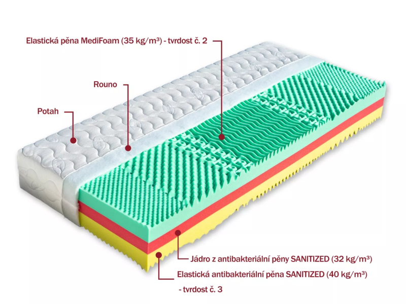 - Materiál matrace………………antibakteriální pěna s úpravou Sanitized (32 kg/m³) / pěna MediFoam (35 kg/m³)