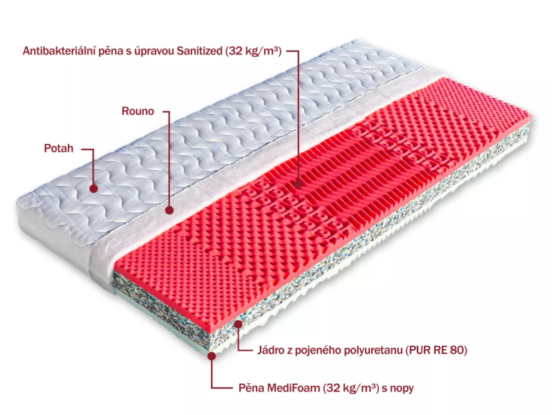 Sendvičová matrace s jádrem z pojeného polyuretanu (PUR RE 80) ve výšce 7 cm. Vrchní stranu matrace tvoří elastická antibakteriální pěna tvarovaná do nopů s úpravou Sanitized (32 kg/m³). Poskytuje trvalou a účinnou ochranu proti bakteriím, roztočům a plísním. Druhou stranu tvoří tvrdší pěna MediFoam (32 kg/m³), taktéž tvarovaná do masážních nopů. Matrace je určená pro širokou škálu uživatelů a je vhodná na všechny typy roštů. Celková výška matrace cca 16 cm. Nosnost do 130 kg.