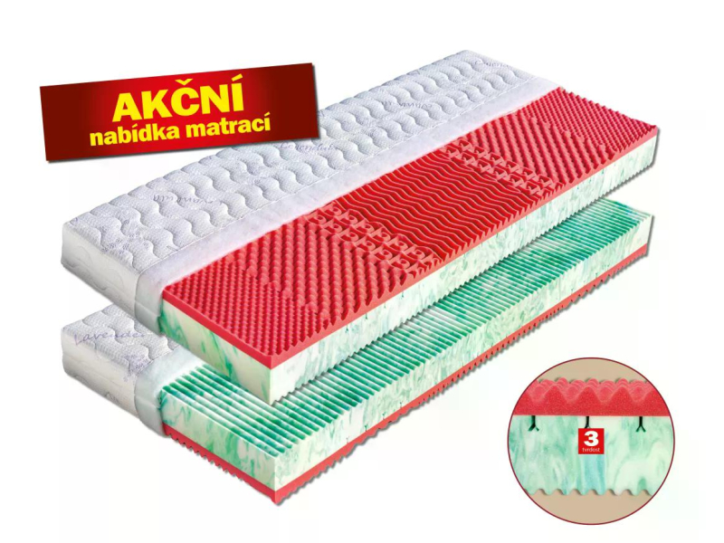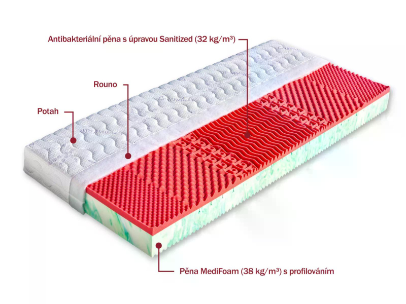 Jádro matrace tvoří vysoce gramážní a velmi elastická hráškově žíhaná pěna MediFoam (38 kg/m³), která je v místech největšího zatížení změkčena speciálními zářezy ve tvaru „Y“. Jemná masážní profilace druhé strany matrace přispívá k uvolnění napjatého svalstva a k provzdušnění matrace. Vrchní červená strana je tvořena antibakteriální pěnou s úpravou Sanitized (32 kg/m³), která poskytuje trvalou a účinnou ochranu proti bakteriím, roztočům a plísním. Její tvarování do masážních nopů napomáhá provzdušnění prostoru mezi povrchem matrace a potahovou látkou. Matrace je vhodná pro alergiky. Může být položena na všechny typy roštů. Celková výška matrace cca 17 cm.